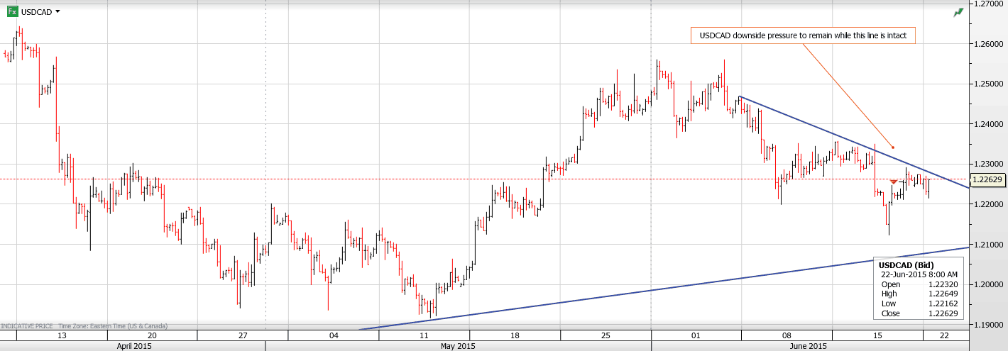 The intraday USDCAD technicals are bearish with the downtrend line from June 5 remaining intact while trading below 1.2280.  A break below 1.2210 will lead to a test of 1.2140 and perhaps 1.2080. A move above 1.2280 would extend gains to 1.2360.