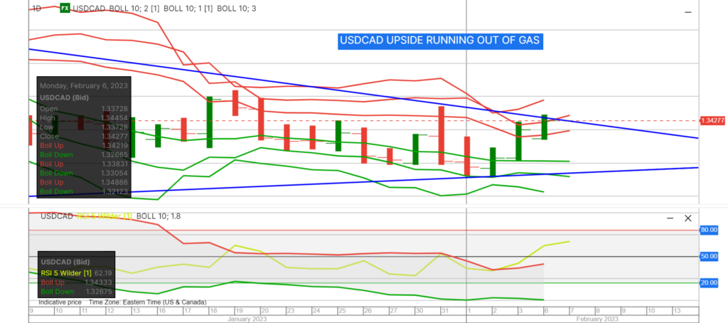 Longer term, Bollinger bands and RSI analysis suggests USDCAD is topping near 1.3484 with a break below 1.3380extending losses to 1.3260.
