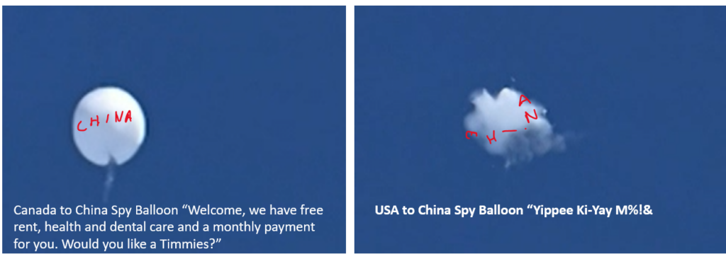 Then there was “Balloon-gate.” A Chinese spy balloon wafted across Canada and the US before the American’s blasted it out of the sky over the Atlantic. Secretary of State cancelled a planned trip to China. China claims the balloon was for climate research and that it just blew off course. Then a senior diplomat, Wang Yi, attempted to educate the Americans on how to deal with accidents in a calm and professional manner. There is no truth to the rumour that a US official quoted Valkyrie’s Colonel Mertz von Quirnheim and said, “Any problem on Earth can be solved with the careful application of high explosives.”