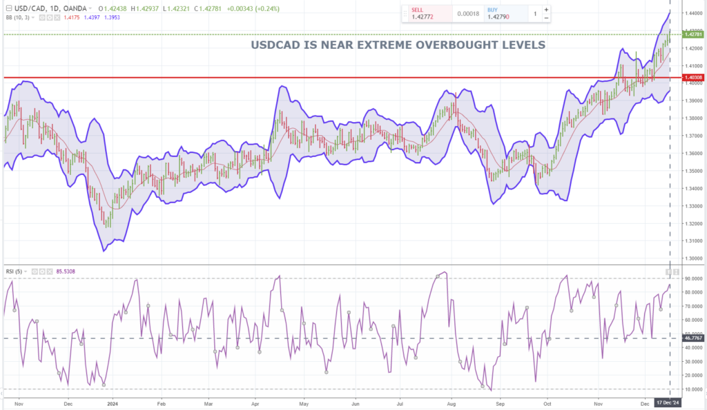 The USDCAD uptrend line from the beginning of October is intact while prices are above 1.4090.the daily chart suggests that there is nothing but daylight to 1.4665 on a break above 1.4320 . However, the momentum studies suggest USDCAD is at, or very near extreme overbought levels which risks a “mean reversion” retreat to 1.4170.