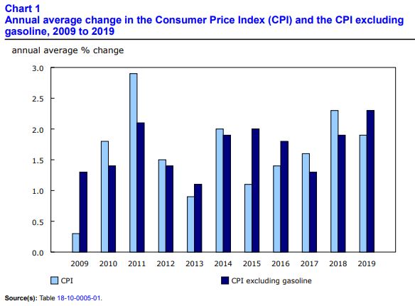 Statistics Canada reported “The Consumer Price Index (CPI) rose 2.2% on a year-over-year basis in December, matching the increase in November. Excluding gasoline, the CPI rose 2.0%, the smallest gain since November 2018.  StatsCanada also reported “Excluding gasoline, the annual average CPI rose 2.3% in 2019, the largest increase since 2003. This increase coincided with favourable labour market conditions, including a low unemployment rate throughout 2019 and strong wage growth in the last seven months of the year.  USDCAD dropped to 1.3038 from 1.3057 on the news then bounced to 1.3048.