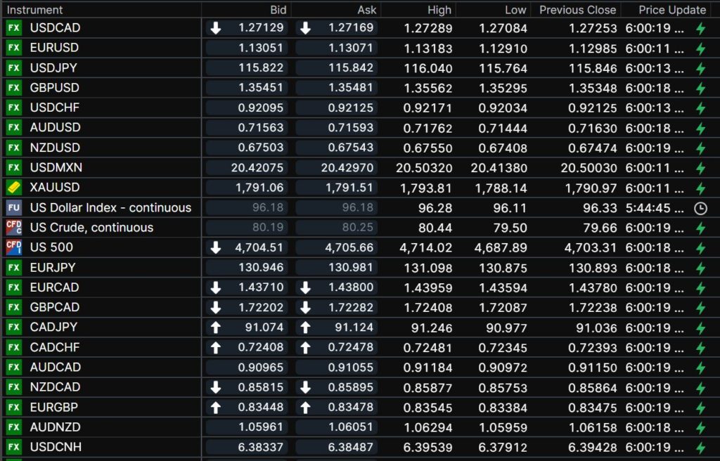FX open, high, low, previous close as of 6:00 am ET