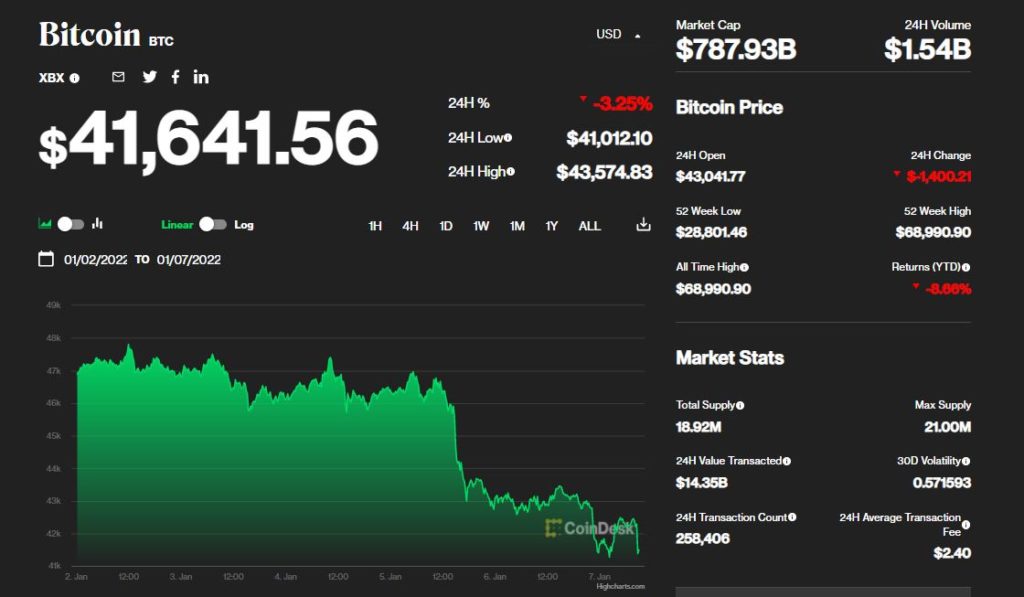 Bitcoin plunged to $41,581.50 from $46,766.25 following the FOMC minutes and is close to retesting that level in NY trading.