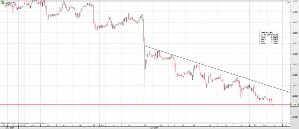 The Canadian dollar squeezed out added gains today on IMF forecasts, domestic data, and oil.  May Wholesale Sales data improved.  The forecast was for a gain of 0.5 percent, a tad lower than the April 1.0 percent rise.  However, today’s 0.9 % increase more than offset the revision to the April data (0.8% vs. previous 1.0%) and USDCAD dipped to 1.2510 from 1.2530.