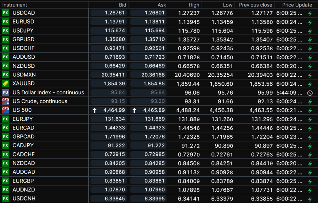 FX open, high, low, previous close as of 6:00 am ET