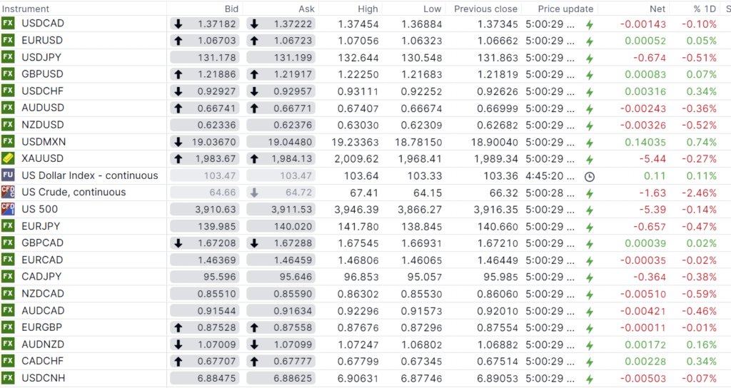 FX open, high, low, previous close as of 6:00 am ET