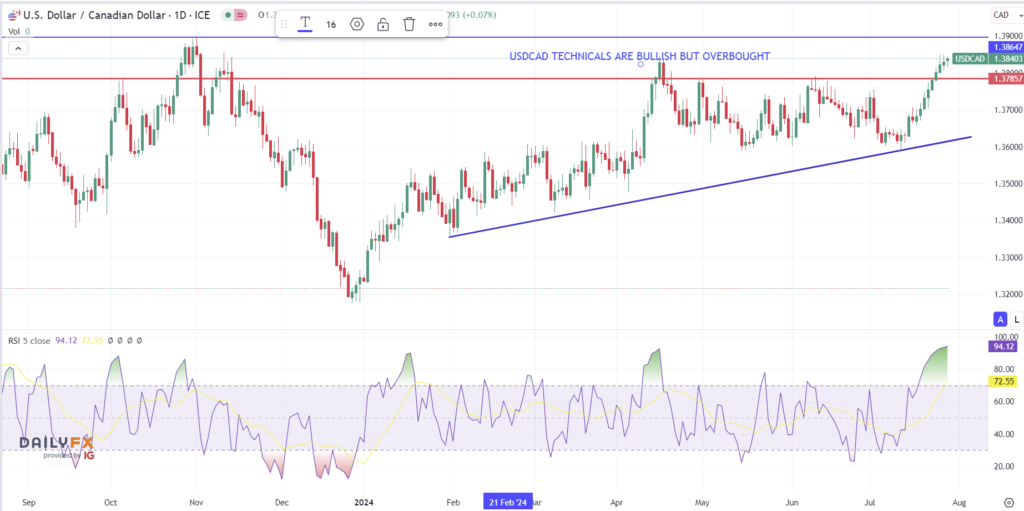 The 2024 USDCAD uptrend comes into play at 1.3610, which is guarded by support in the 1.3750 area.