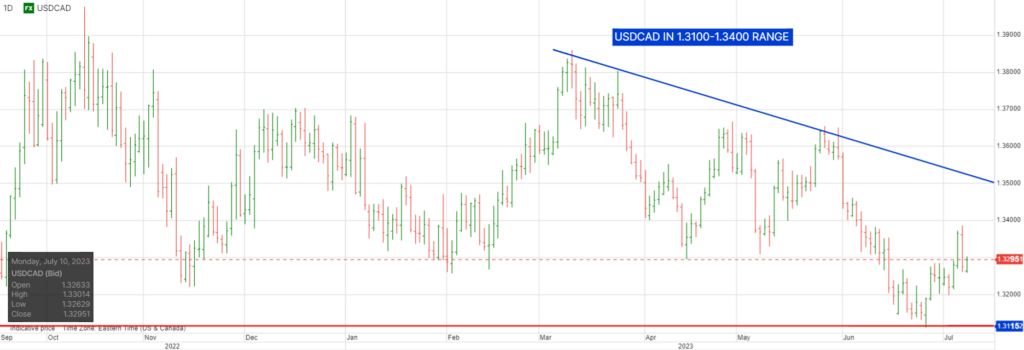 USDCAD traders are looking ahead to Wednesday’s Bank of Canada (BoC) monetary policy meeting when a 25 bps rate hike to 5.0% is almost guaranteed by the hotter than expected jobs data.  The BoC will release the summer Monetary Policy Report, which lately is a package of pretty charts containing inaccurate forecasts.