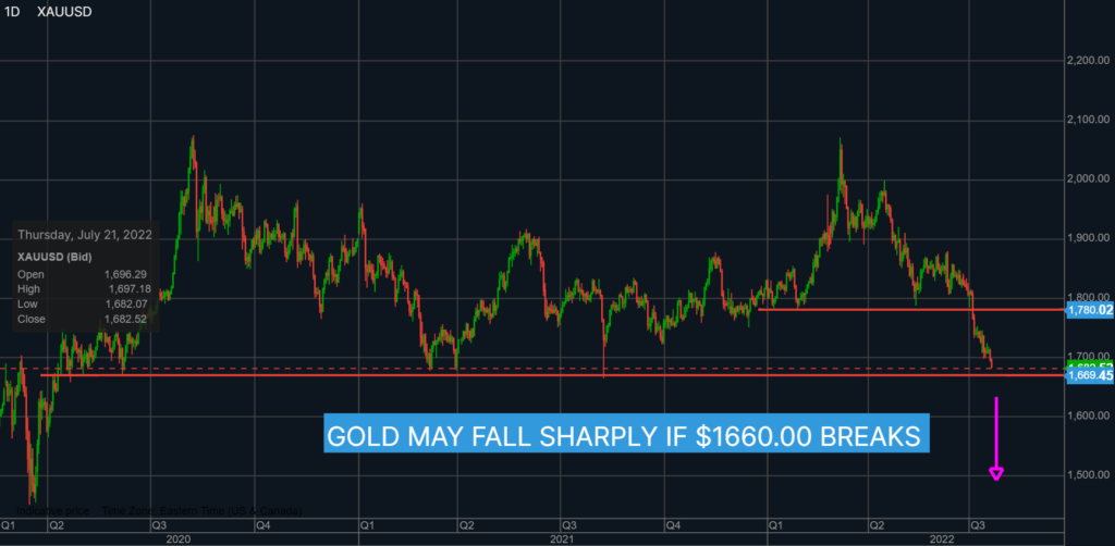 Gold bulls felt rather smug when prices soared above $2,000/ounce following the Russian invasion of Ukraine. Bombs and bullets are good for gold. Self-righteous, born-again, inflation-fighting central bankers, not so much. Fears of sharply higher US interest rates drove XAUSUD below support at $1780.00 in early July, and prices are just above support that stretches back to April 2020. A move below this level opens the door to the pandemic low of $1465.00.