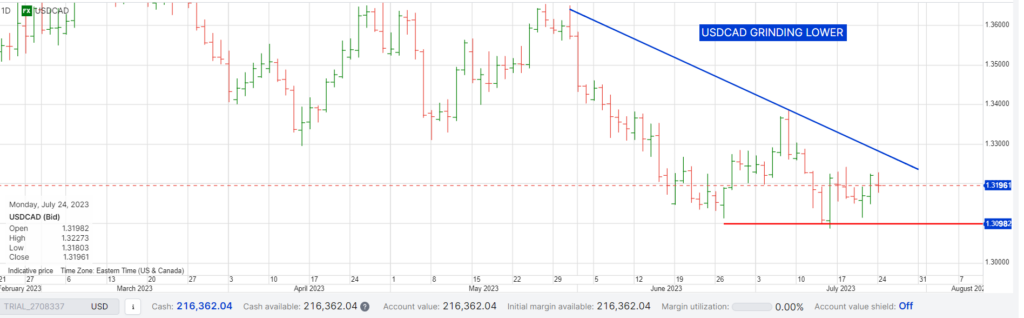 The Bank of Canada’s 25 bps rate hike on July 12 continues to act as a drag on USDCAD gains, especially since there could be another rate bump in the pipeline. The BoC monetary policy statement hinted at such a move, noting, “While CPI inflation has come down largely as expected so far this year, the downward momentum has come more from lower energy prices, and less from easing underlying inflation. With the large price increases of last year out of the annual data, there will be less near-term downward momentum in CPI inflation.”