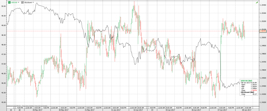 Chart: USDCAD 1 hour with WTI oil prices overlaid