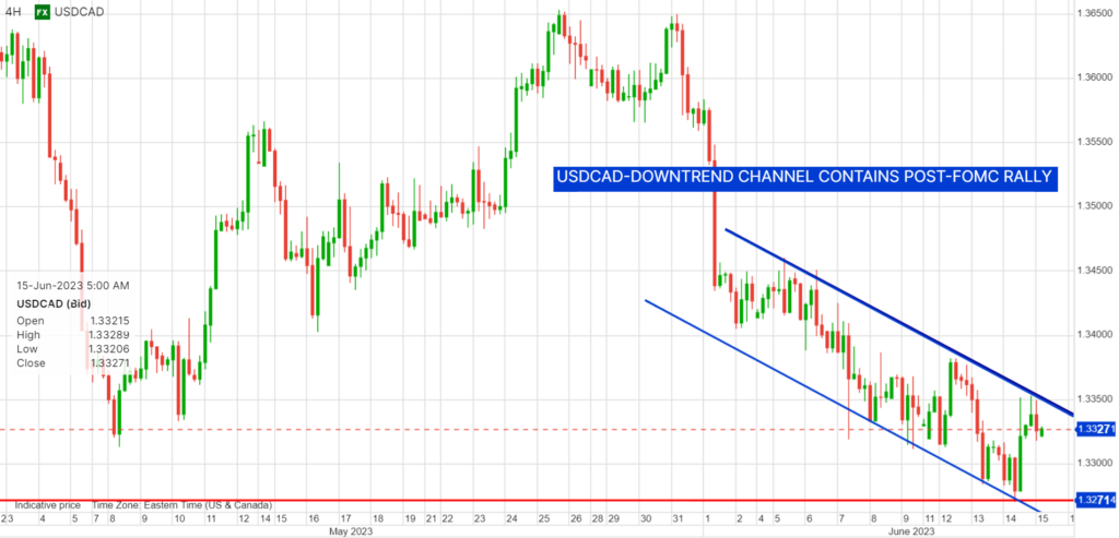 USDCAD is struggling to make further gains because the Bank of Canada’s forward guidance is somewhat hawkish after it ended its “rate pause” period on June 7 when it raised rates by 25 bps. The BoC statement indicated that monetary policy was not sufficiently restrictive which implies another rate increase sooner, rather than later.