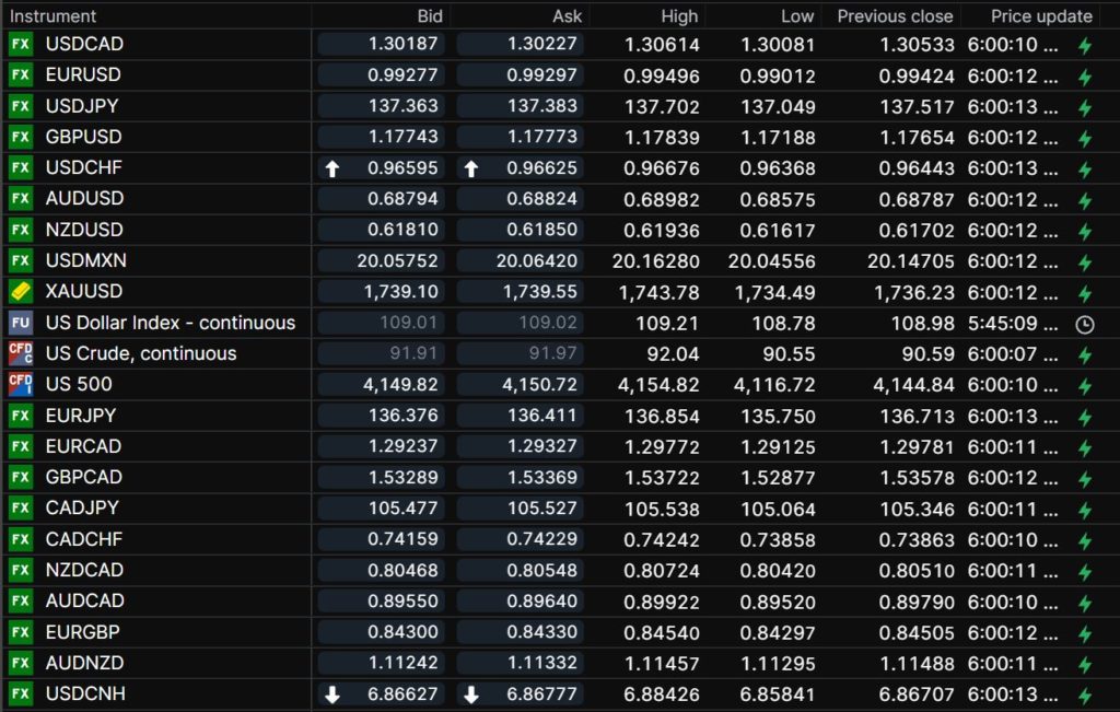 FX open, high, low, previous close as of 6:00 am ET