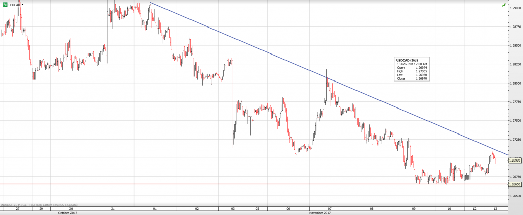 Loonie traders were mostly spectators to a busy overnight FX session.  USDCAD drifted higher as it consolidated last week’s losses.  Firm oil prices ahead of the November 30 Opec meeting are competing with divergent BoC/Fed short-term interest rate policies and NAFTA concerns for directional dominance.