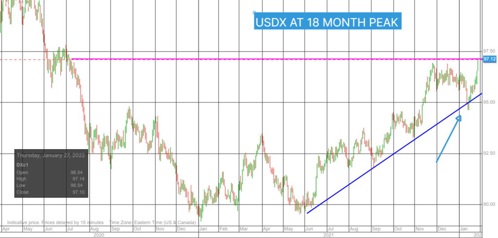 Global equity indexes were whippy following the FOMC meeting. The major Asia equity indexes closed with steep losses led by a 3.11% drop in Japan’s Nikkei 225. European bourses are mixed. The UK FTSE 100 is a tad higher, while the German DAX is red. S&P 500 futures are flat after a roller coaster overnight session. The US 10-year Treasury yield consolidates yesterday’s gains in the 1.82% area. The US dollar index surged to an 18-month peak rising from 96.40 to 97.14.