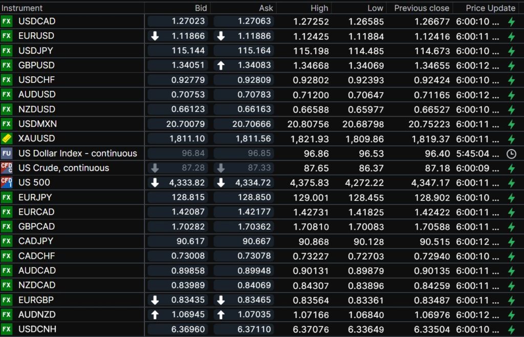 FX open, high, low, previous close as of 6:00 am ET