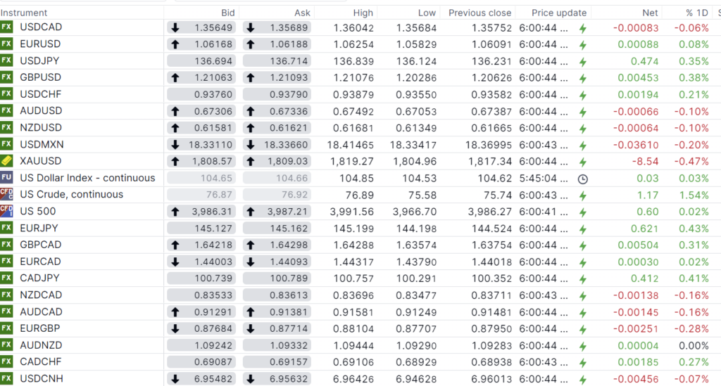 FX open, high, low, previous close as of 6:00 am ET