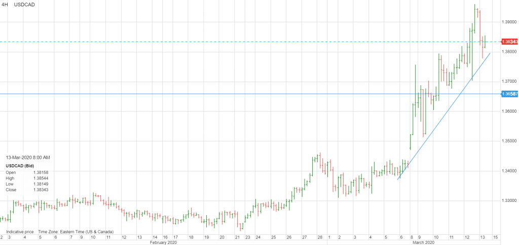USDCAD soared to 1.3950 yesterday and closed at 1.3924. Prices were boosted by weak-oil prices, coronavirus fears leading to cancellations and closures and broad demand for US dollars. However, the Fed’s liquidity injection leading to mild risk-on sentiment overnight attracted sellers and USCAD slid to 1.3786 at the NY open, before climbing to 1.3800. The Canadian’s government’s tepid response to the COVID-19 outbreak is also supporting USDCAD.
