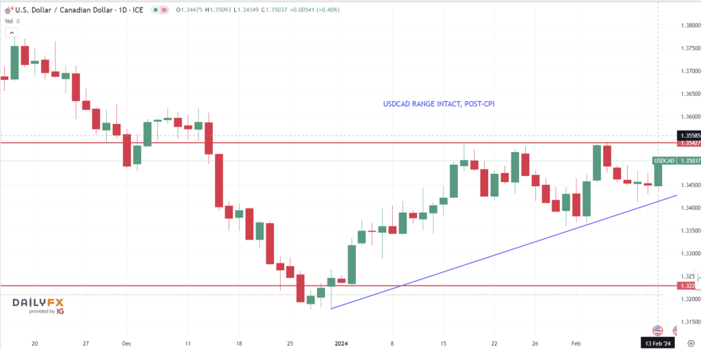 USDCAD spiked to 1.3537 from 1.3440 after US CPI disappointed markets.  Traders were positioned for January CPI to drop 0.5% from December’s 3.4% result. It only fell 0.3% and weak USDCAD short positions scrambled to cover.
