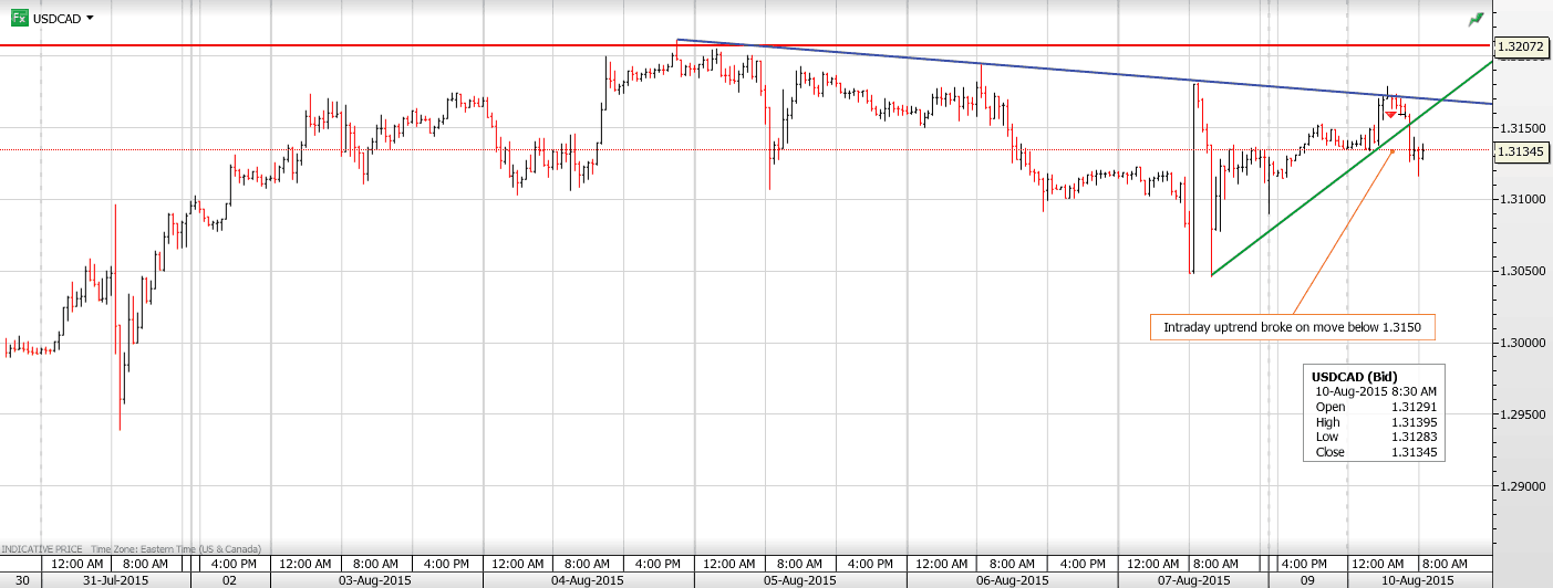 Chart: USDCAD 30 minute with intraday uptrend break noted.