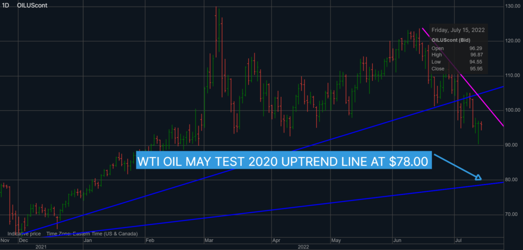 Recession fears, and concerns about Chinese growth hammered WTI oil prices and snapped the 2021 up trendline, last week. Oil has given back most of its gains following the Russian invasion of Ukraine, but until Russian sanctions are lifted, the downside is limited.