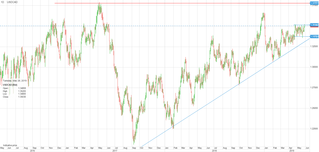 USDCAD tested major resistance at 1.3520 in early New York trading. It held, but the retreat is shallow. Prices climbed steadily alongside broad US dollar demand from renewed risk aversion trades. It may not get a reprieve from the Bank of Canada policy meeting today. The prevailing sentiment is that the BoC will leave interest rates unchanged, and issue a tame statement that echoes the previous one. The RBA and RBNZ are cutting rates, and the rest of the G-10 central banks have easy monetary policies in place. The BoC was late to the party and only shifted to “neutral” April 24. They were concerned about increasing global trade risks then, and those risks have worsened. However, there is a risk, that the statement could have a forward-looking, upbeat tone considering the recent robust employment and GDP reports and the repeal of US tariffs on Canadian steel and aluminum. If so, USDCAD may revisit the bottom of its 1.3370-1.3520 range