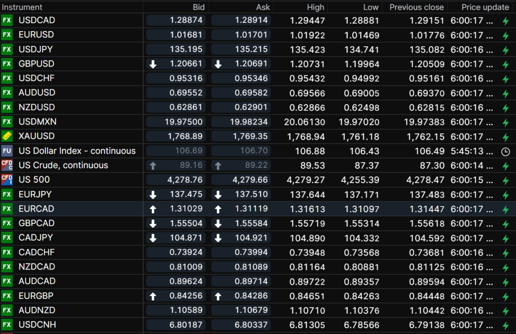 FX open, high, low, previous close as of 6:00 am ET