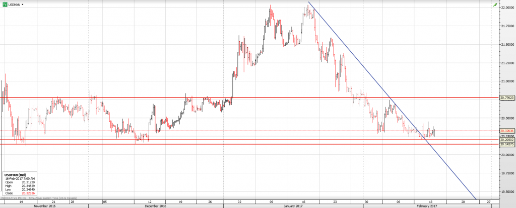 The USDMXN decline from the middle of January appears to have found a base in the 20.2050 area, supported by the break of the downtrend line with the move above 20. 2740.. A break above 20.4450 would extend gains to 20.7700. A break below 20.2050 would lead down to 20.1475