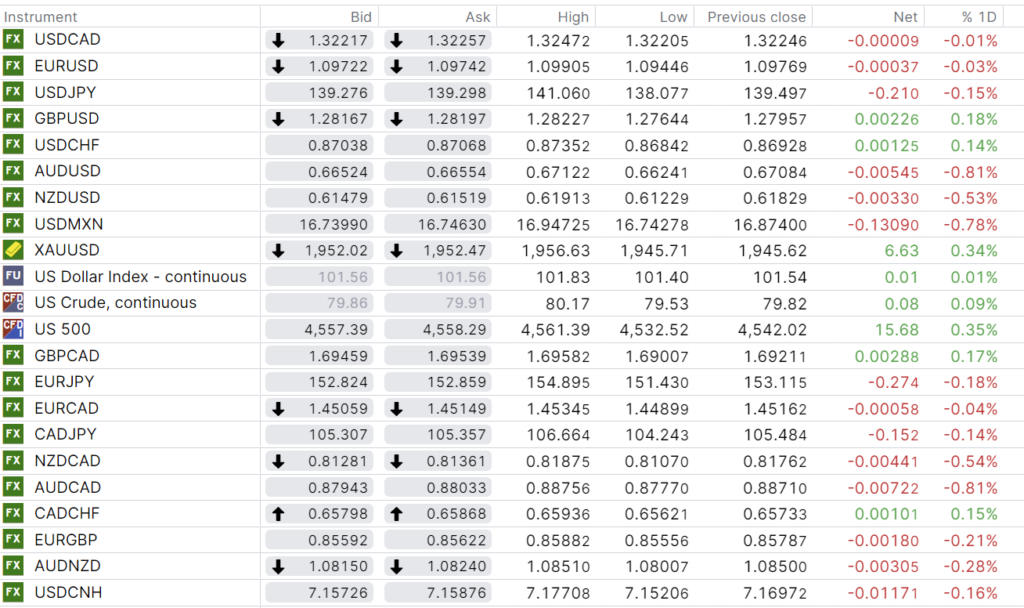 This morning the data-dependent Fed saw more favourable data. Today’s Employment Cost Index (actual 1.0%, forecast 1.1%, previous 1.2%)%, and Core Personal Consumption Expenditures Price Index (actual 4.1% forecast 4.2%, previous 4.6%) are exactly the kind of data they want to see if they do not want to raise rates.Traders liked the news. The US dollar sank, stocks gained, and the US 10-year Treasury yield inched down to 3.968%.