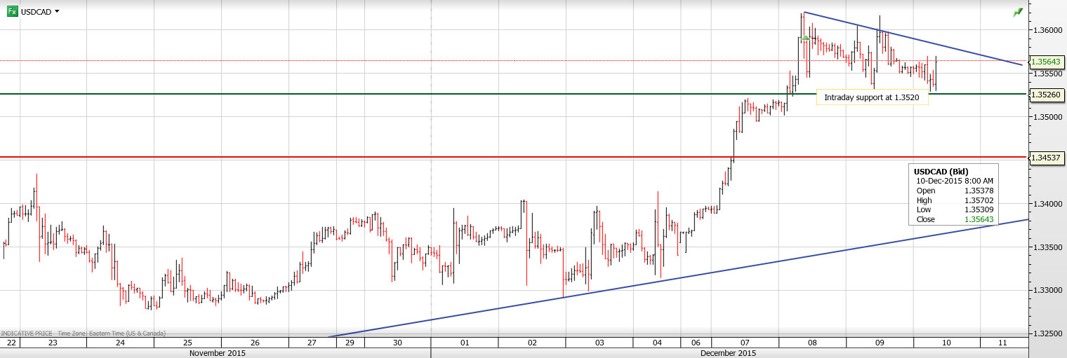 The intraday USDCAD technicals are bearish while trading below 1.3580 looking for a break of support at 1.3520 to extend losses to 1.3460. A move above 1.3620 suggests further gains to 1.3680 and then 1.3720. A break of 1.3460 will lead to a test of 1.3390.