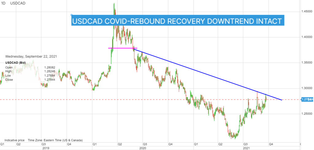 USDCAD closed with a bid tone at 1.2812 Tuesday, rising in concert with the sliding S&P500 index. The rally reversed in Asia after reports that Evergrande Group made a domestic bond interest payment. Prices consolidated inside a 1.2772-1.2804 range into the NY open.