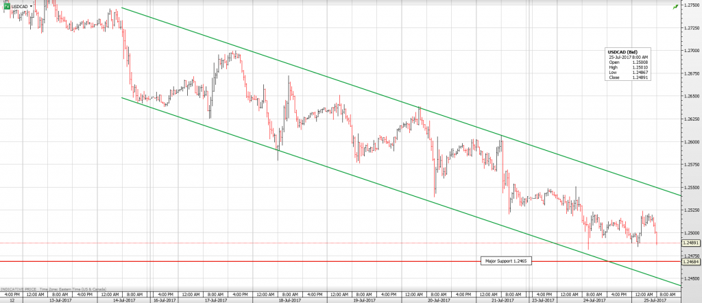 The intraday USDCAD technicals are bearish. The downtrend from the July 12 break of support at 1.2850 is intact while prices are below 1.2580 and keeps the focus on key support at 1.2465. A break of this level opens the door to further losses to 1.2050. A move above 1.2580 targets 1.2750.