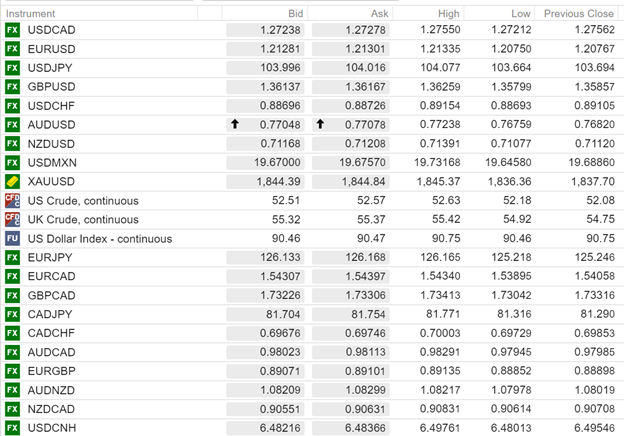 FX open (6:00 am EDT) High, Low, and previous close
