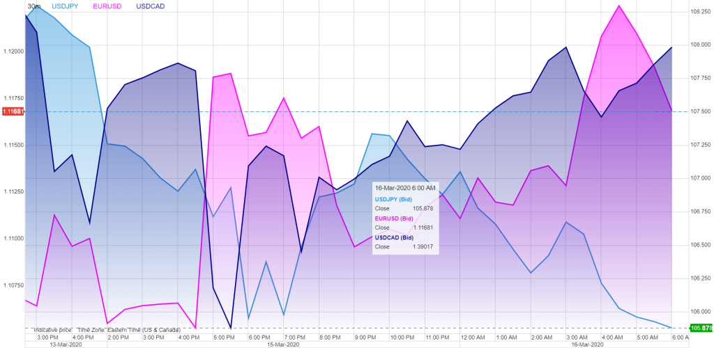 FX Recap and outlook: The Fed fired its big guns in a rare Washington Sunday night action. They announced a massive 100 basis point cut to the range for Fed Funds slashing it from 1.0-1.25% to 0.000-0.25%. They also announced new mortgage-backed securities and Treasury purchases to the tune of $700 billion. The Fed justified its move saying “The coronavirus outbreak has harmed communities and disrupted economic activity in many countries, including the United States. Global financial conditions have also been significantly affected.”