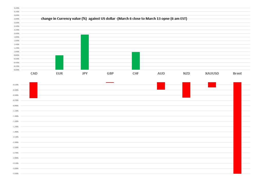 Chart: Currency gain/loss (%) against the US dollar from NY close March 6 to March 13 NY open (6:00 EST)