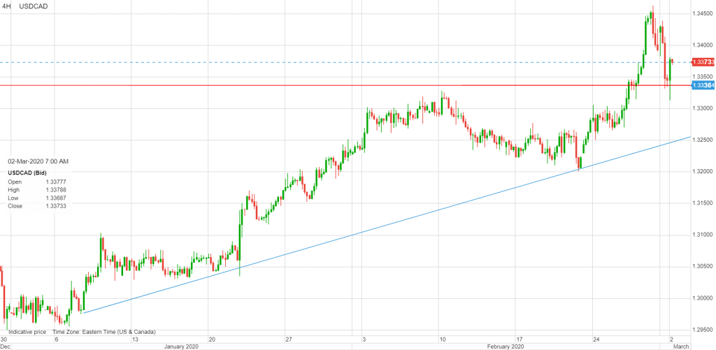 USDCAD is mirroring EURUSD moves. EURUSD punched above resistance at 1.1105 when early NY traders joined the G-7 rate cut speculation party. USDCAD dropped from 1.3455, Friday to 1.3318 this morning, and then bounced to 1.3372. Domestic concerns such as increased risks that the Bank of Canada cuts interest rates by 0.25% on Wednesday, and elevated risk of a domestic economic slowdown due to low oil prices and COVID19, are being ignored. Instead, hopes that a G-7 coordinated interest rate cut is driving sentiment.