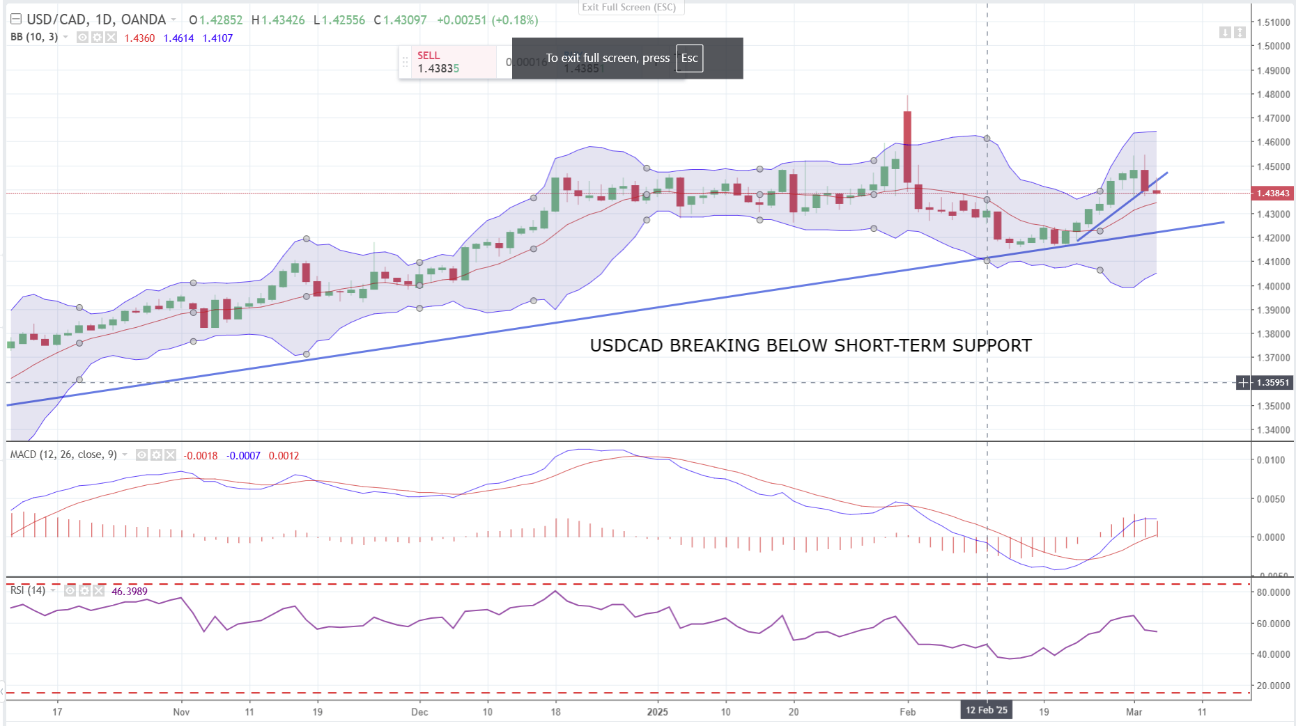 The daily chart shows USDCAD remains in an uptrend with Bollinger bands confirming bullish momentum is intact.