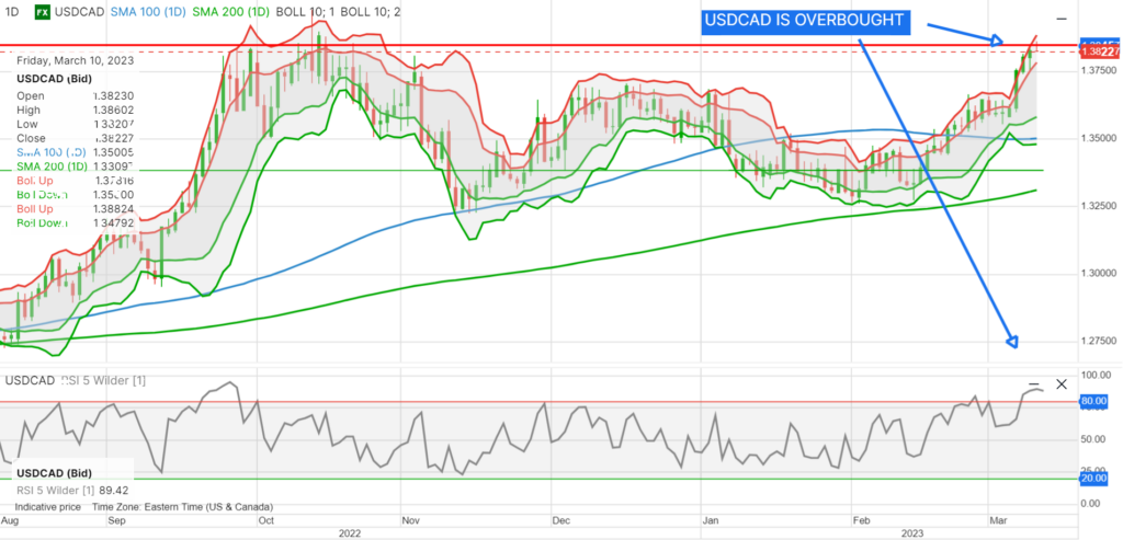 The daily charts indicate USDCAD is overbought based as Bollinger band and RSI studies are at extreme levels.