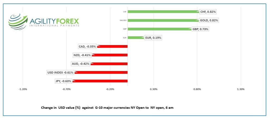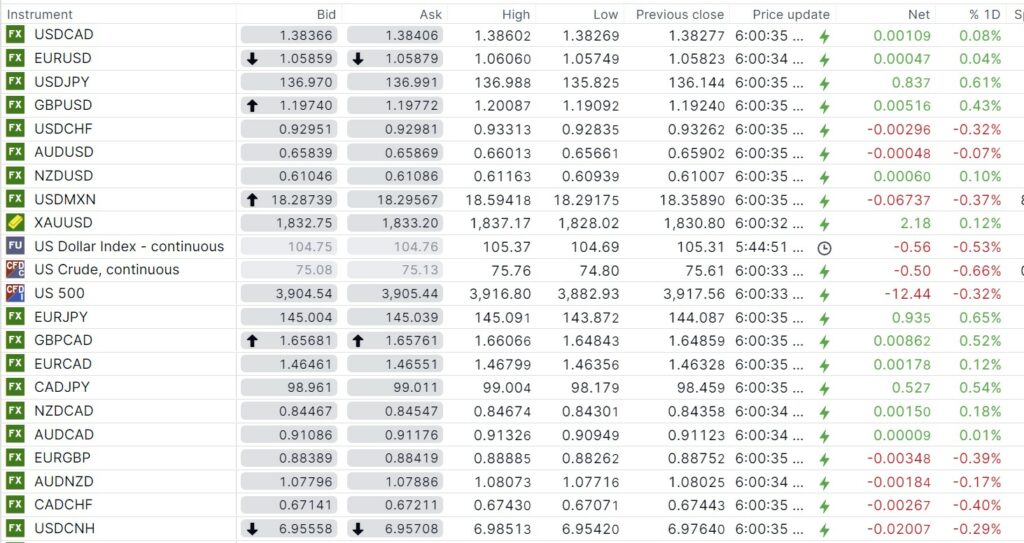 FX open, high, low, previous close as of 6:00 am ET