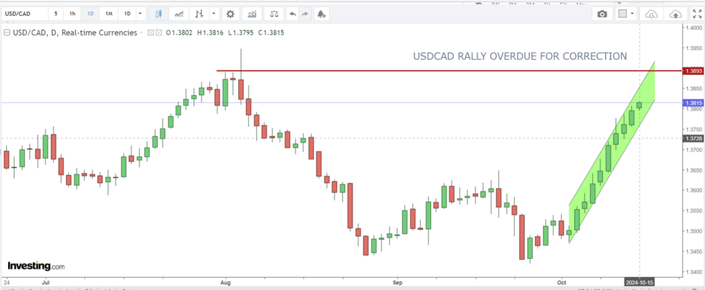 USDCAD jumped from 1.3819 to 1.3836 after inflation cooled by 0.4% m/m in September (August -0.2%) and rose 1.6% compared to the forecast for a 1.8% increase and 2.0% y/y in August. This data combined with Friday’s labour force survey almost guarantees a 50 bps rate cut on October 23.