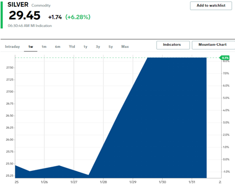 Silver (XAGUSD) jumped over 10% today, with some suggesting the move is contagion from the GameStop, AMC insanity. Perhaps, but as the UK Guardian notes, it doesn’t seem to be a WallStreetBets fueled move. Another analyst noted that the market for silver is far deeper than the small stocks like GameStop, making it far more difficult to create an effective short squeeze.
