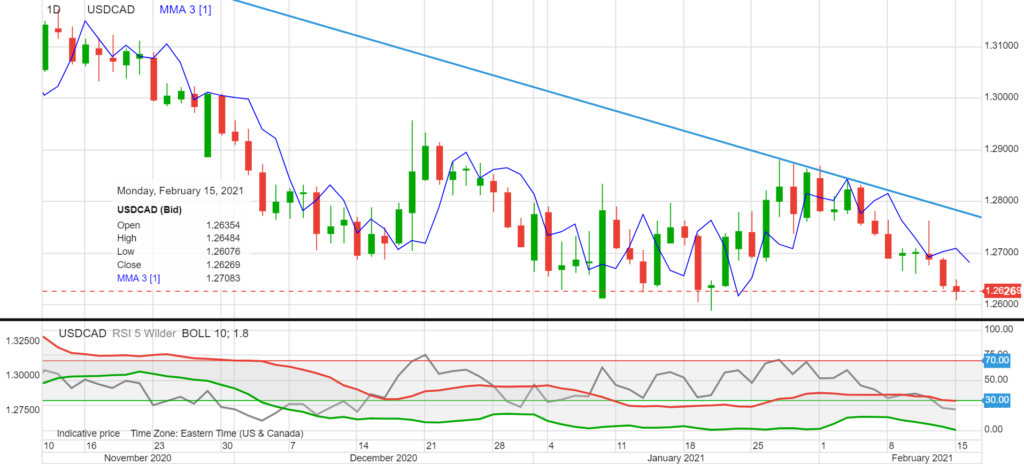 USDCAD dropped to a low of 1.2612 with prices undermined by WTI oil enjoying a brief peek above $60.00/barrel. Prices then bounced reaching 1.2670 in NY trading. Widespread US dollar selling pressures and bearish technicals also weighed on prices.