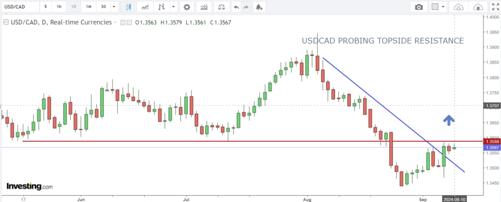 USDCAD traded sideways overnight. Traders did not get excited about the surge in Chinese exports or even the better than expected UK employment data. Instead they twiddled their thumbs while awaiting tonight’s US presidential debate and tomorrows US inflation data. CPI has diminished importance as the Fed’s focus is on the job market. However, a sharply higher inflation reading would rattle analysts as it could slow the pace of rate cuts.