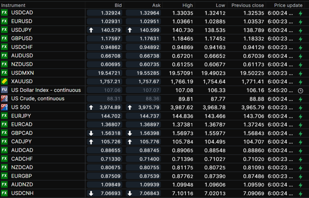 FX open, high, low, previous close as of 6:00 am ET