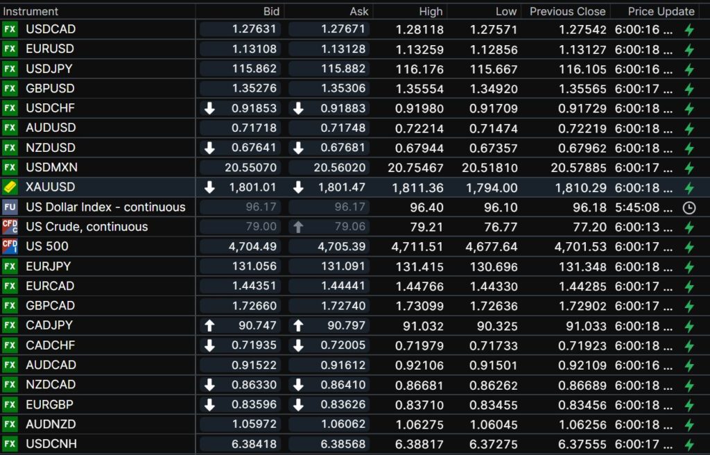 FX open, high, low, previous close as of 6:00 am ET