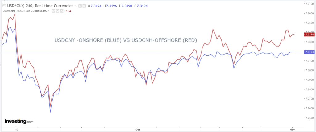 Chart: USDCNY (onshore) vs USDCNH (offshore) hourly