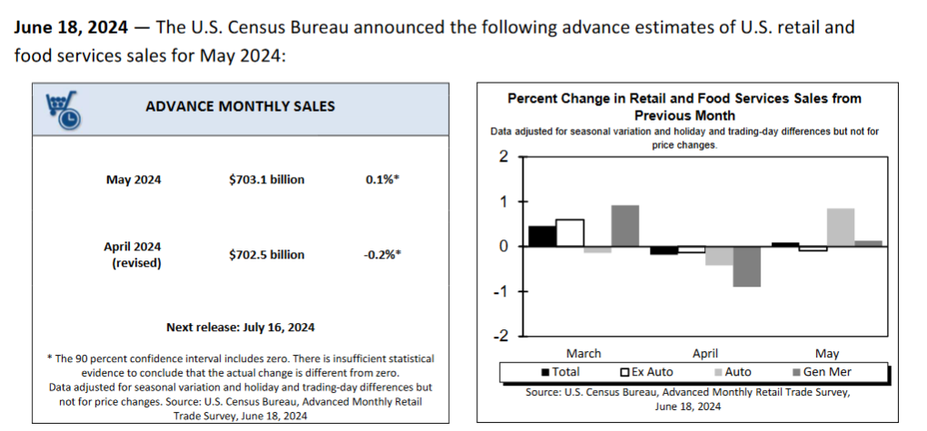 US consumers were not buying as much as anticipated in May. Retail Sales rose 0.1% in May (forecast 0.2%,) and April’s result was revised down from 2.0% to -0.1%. The result knocked the US 10-year Treasury yield down to 4.251% from 4.92% at today’s open.