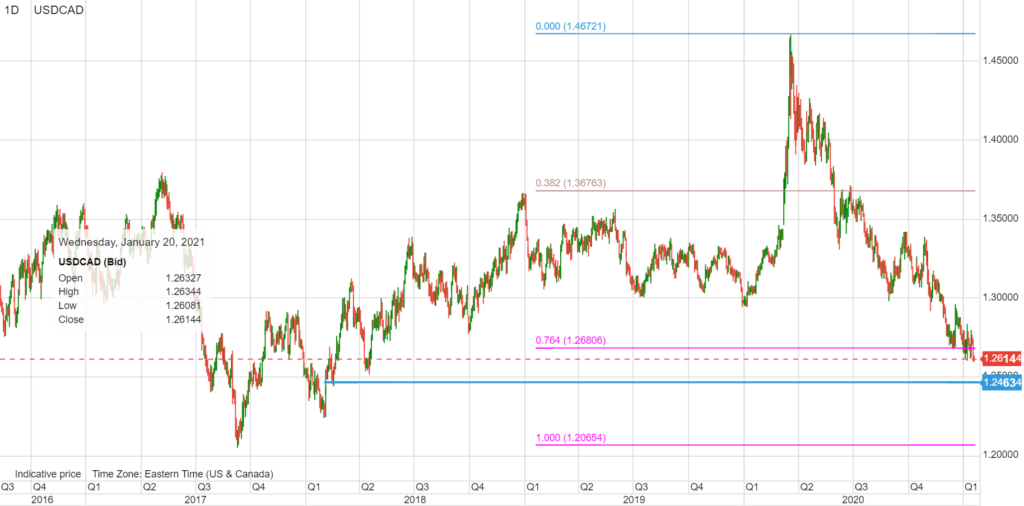USDCAD open (6:00 am ET) 1.2619-23, Overnight Range 1.2612-1.2634, Previous Close 1.2633
