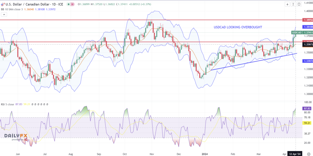 Bollinger band and RSI studies warn USDCAD is overbought and vulnerable to a correction.