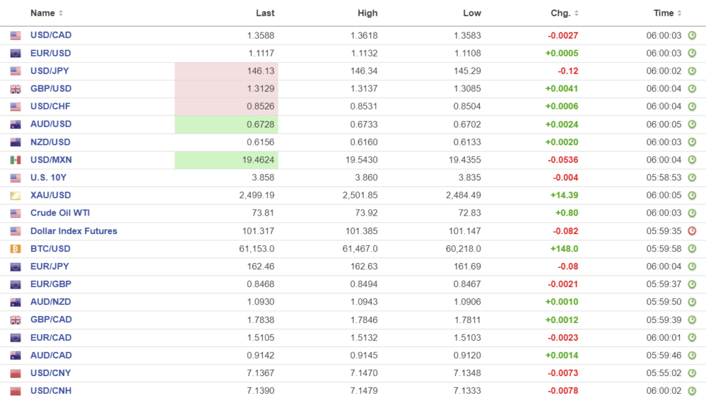 FX high, low, open (as of 6:00 am ET)